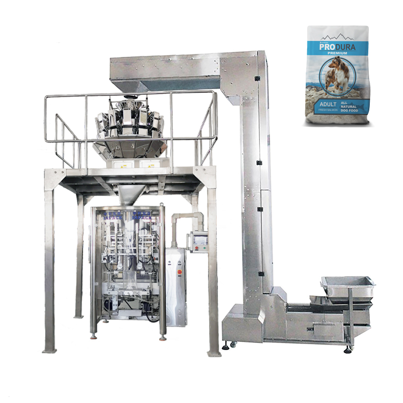 Тази производствена линия включва един комплект ZL14-1.6L машина за претегляне с няколко глави. Един комплект ZL520 Вертикално оформяне на торба, запечатване за пълнене, един комплект кофичен елеватор тип Z и един комплект платформа и стълба. Цялата машина може автоматично да измерва малък гранулиран продукт и да го опакова в торбичка с рулонно фолио. Широко се използва за опаковане на чипове от захар от оризови зърна и т.н. Цялата машина е направена от неръждаема стомана 304, тази машина е оборудвана с производство на торби, рязане, отпечатване на кодове, и др. Siemens PLC и сензорен екран, серво мотор на Panasonic, японски фотосензор, корейски въздушен клапан и др.