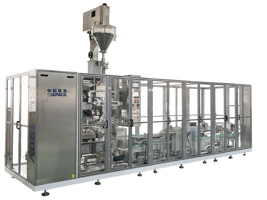 Тази машина включва един комплект ZL520 вертикална машина за опаковане и запечатване. Един комплект ZL2000 Шнекова измервателна машина, Един комплект ZL100V машина за опаковане с една вакуумна камера и един комплект изходен конвейер. Тази машина се използва широко за опаковане на хранителни химикали и други продукти в прах или малки гранули. Като кафе на прах, дрожди на прах, пшенично брашно и така нататък. Цялата машина приема вътрешно изпомпване за вакуумиране на продукта. Степента на вакуум е много висока и скоростта на опаковане е много висока, може да достигне 8 торба/мин. Крайният продукт е много хубав и има дълъг срок на годност.
