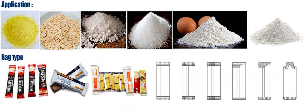 Тази машина се използва главно за опаковане на продукти на прах: като мляко на прах, млечен чай на прах, кафе на прах, подправки, къри на прах, белтъчини на прах, подправки, билкови прах, химически и медицински прахове.
