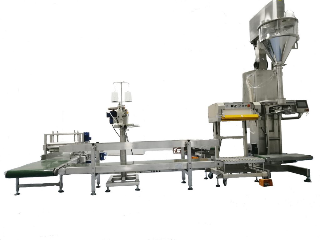 1, Пневматична скоба за торби и платформа, оборудвани с динамометрична клетка за справяне с две скорости на пълнене според предварително зададеното тегло. Отличава се с високоскоростна и прецизна система за претегляне, за да се гарантира висока точност на опаковане.