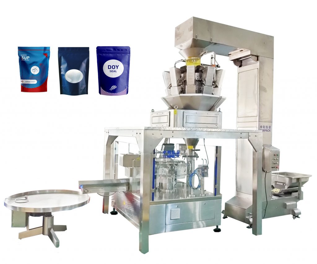 Предварително изработената машина за пълнене и уплътняване на торбички, състояща се от 8 работни станции за ефективност и стабилност, подчертава пакета стоящи чанти, чанти с ципове, торбичка за дюзи и различни предварително направени торбички. Съвместно с различни системи за дозиране (комбиниран тегловен / линеен тежест / шнеков шнек / бутален пълнител) и автоматични повдигателни конвейри, той се прилага широко за гранули, течности и прах.