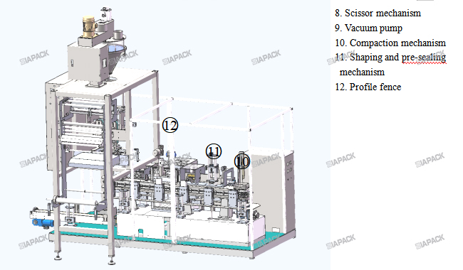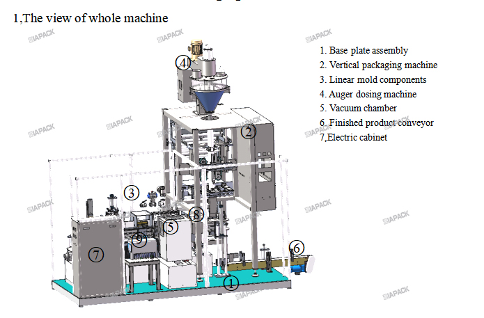 Формиране на торби → бране на торби → рязане → вибрация → оформяне и предварително запечатване → вакуумиране → пускане и избутване на торби → доставка на готовия продукт